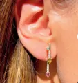 Brinco Geométrico Cravejado com banho de ouro 18k e detalhes multicoloridos. Design moderno em estrutura assimétrica, cravejado com pequenas zirconias que captam a luz. Leve, confortável e resistente, ideal para uso diário ou produções de festa. Combina com tons neutros e peças coloridas, realçando qualquer look com toque elegante e atual. Medida altura 3cm.