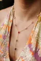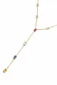 Colar delicado banhado a ouro 18k, com corrente fina e pedras coloridas em taças quadradas que adicionam brilho discreto. As gemas facetadas captam a luz a cada movimento, oferecendo toque de cor e elegância para o dia a dia ou ocasiões especiais. Leve, confortável e versátil, combina com roupas neutras e agrega charme a qualquer look. Medida 40cm mais 5cm de extensor.