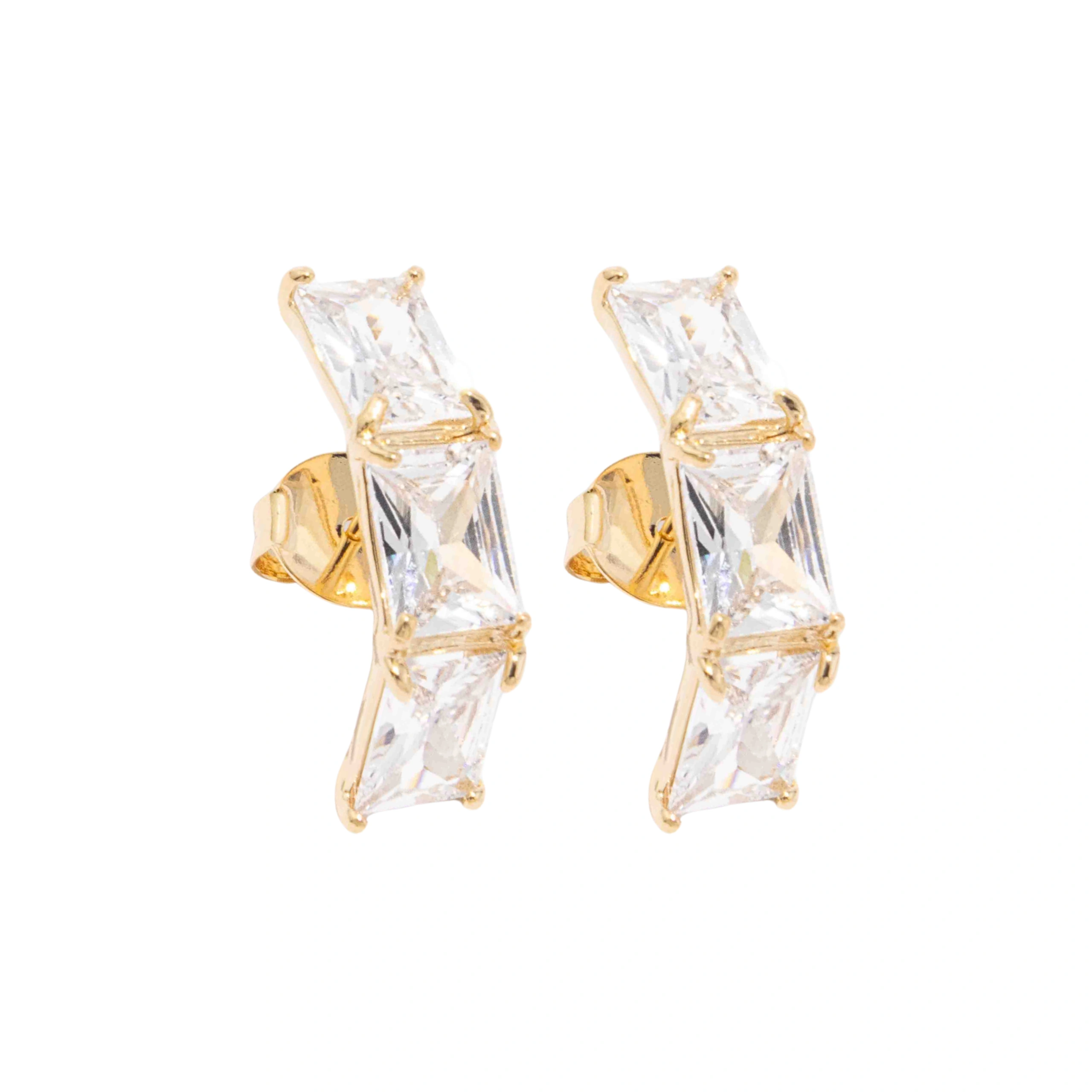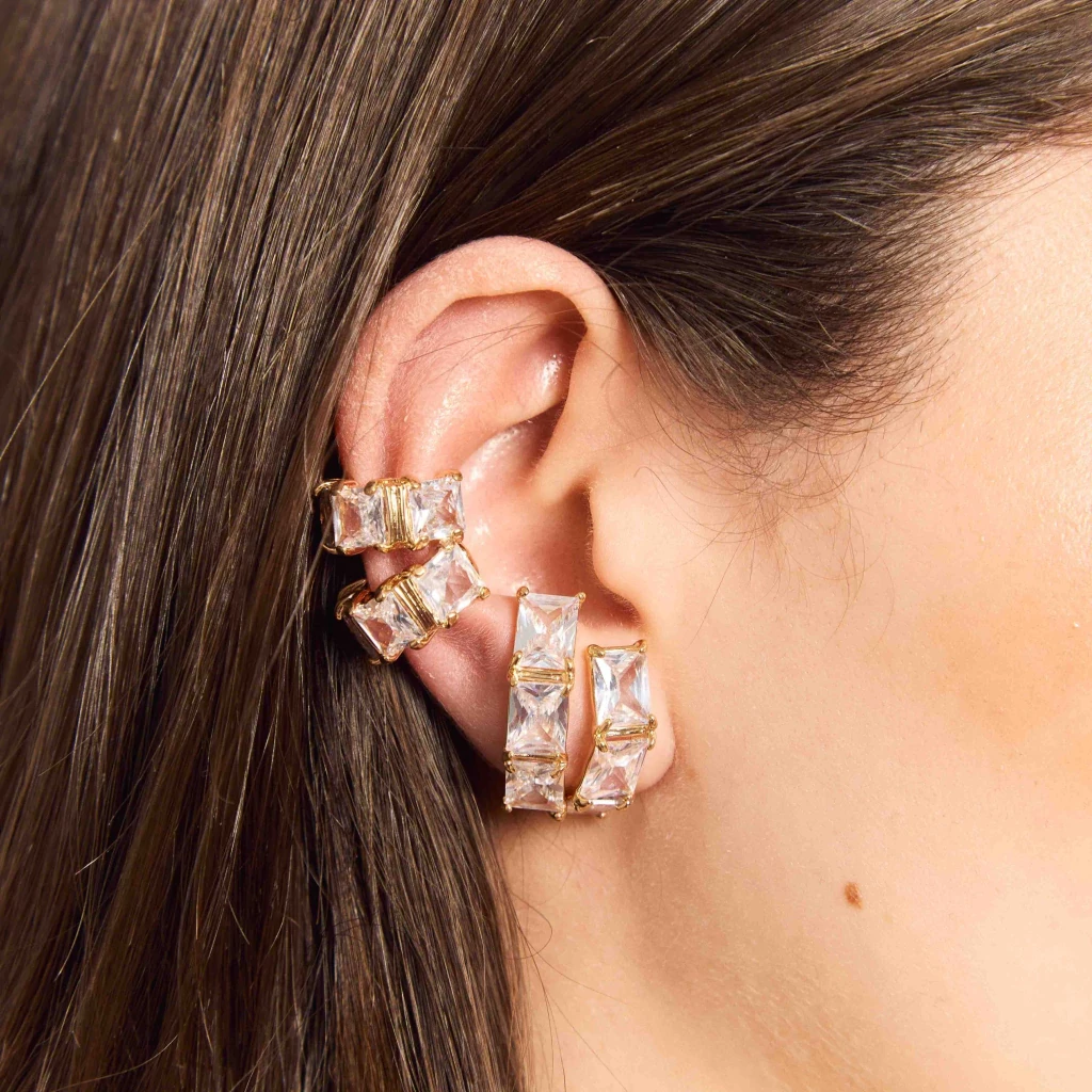 O ear hook Vogue é um modelo elegante em pedraria, composto por zircônias retangulares levemente curvadas. (2,3 cm de altura do ear hook / 0,6 cm de largura do ear hook / 0,8 cm de altura da zircônia)