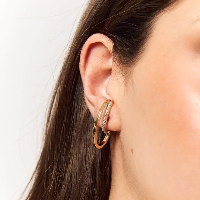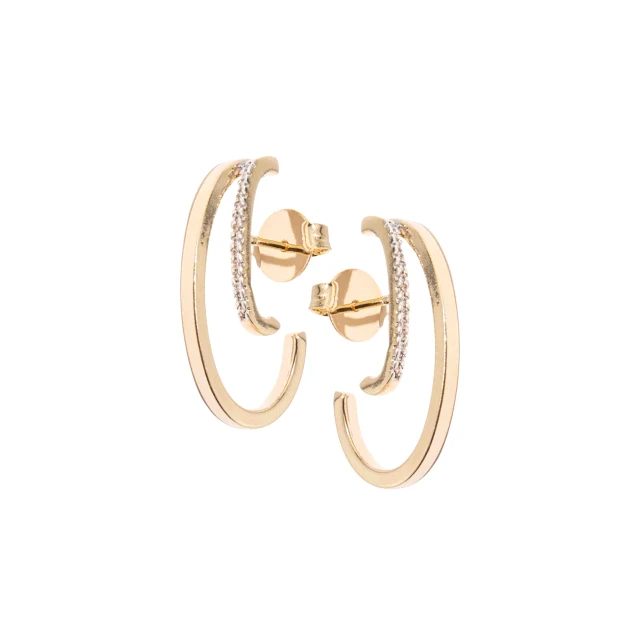 O brinco Voyage possui um design minimalista e elegante. Ele apresenta dois fios curvados: um com aplicações de zircônias e outro com acabamento liso. (3,0 cm de altura do fio maior / 0,2 cm de espessura do fio maior / 2,0 cm de altura do fio menor / 0,1 cm de espessura do fio menor)