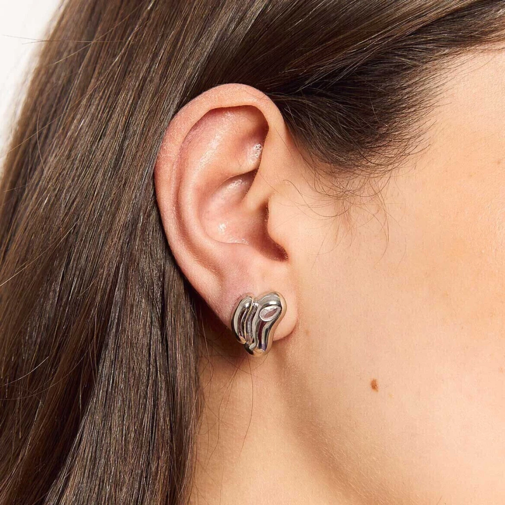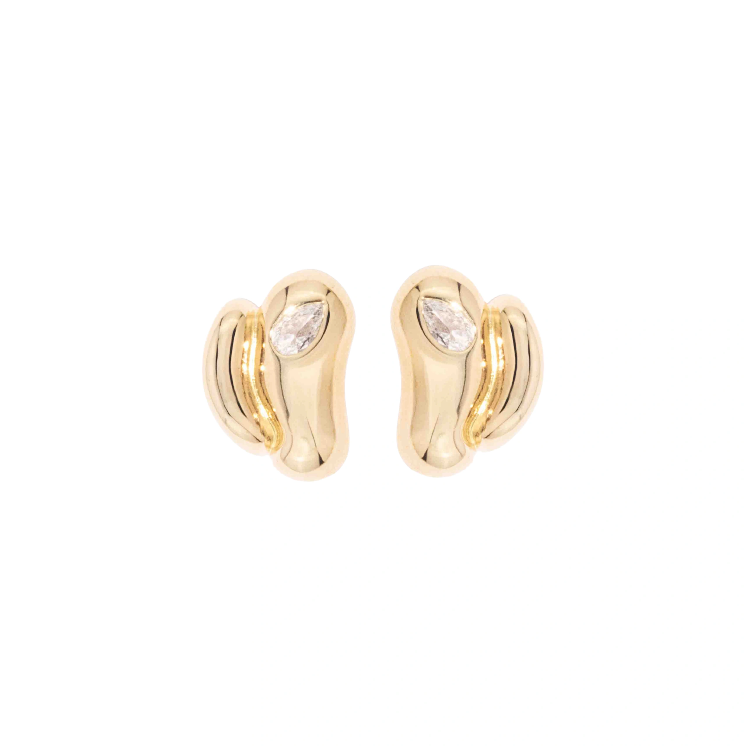 O brinco Denali apresenta um formato orgânico e irregular, com aplicação de uma zircônia em formato de gota. (1,0 cm de altura / 1,6 cm de largura / 0,5 cm de altura da zircônia / 0,3 cm de largura da zircônia)