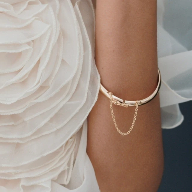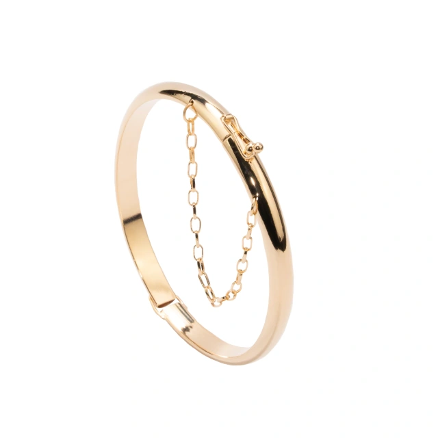 O Bracelete Single possui design liso e fecho tipo gaveta, com corrente de segurança. Delicado e casual. (0,6 cm de largura / diâmetro interno: 18,5 cm).