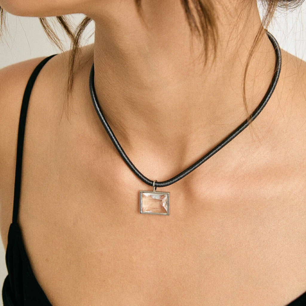 A Gargantilha Prisma possui design moderno e elegante, composta por um cordão estruturado em tom escuro, o destaque da peça é o pingente geométrico com cristal de vidro em formato retangular. Conta ainda com extensor na corrente, permitindo melhor ajuste ao pescoço e garantindo conforto no uso. ( 39 cm de comprimento do cordão / 9,5 cm de extensor / 2 cm de comprimento do pingente / 1,5 cm de altura )