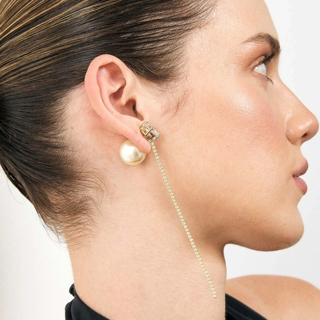 O Brinco Ópera é versátil e composto por três partes: brinco ponto de luz em pino, pingente em fileira de zircônias e tarraxa embutida em pérola. Você pode usá-los juntos ou criar suas próprias combinações: experimente o ponto de luz apenas com a tarraxa de pérola, ou retirar a tarraxa de outro brinco effeá e usar apenas o ponto de luz com pingente. Também pode usar o pingente em qualquer outro brinco que possa ser passado o encaixe no pino ou argola. Um brinco moderno e multifuncional, indispensável para quem ama personalizar. (1 cm de largura e altura do ponto de luz / 11 cm de pedrinhas / 1,6 cm de diâmetro da pérola